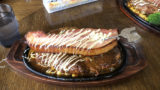 「ハンバーグ」は、100gのハンバーグが2コ鉄板の上にのっています。自家製デミグラスソースをたっぷり。
