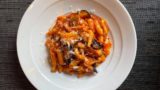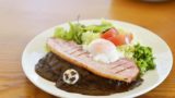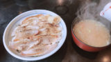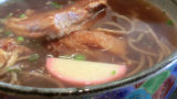 富士山の天然水でしめることでコシが強くなります。茹でキャベツと甘辛く煮た馬肉をのせます。